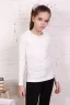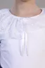 Блузка для девочек младшего и старшего школьного возраста, из однотонного трикотажного полотна кулирка с лайкрой. Блузка полуприлегающего силуэта, с втачным рукавом, без застежки. Спереди и на спинке отсутствуют линии членения. Срез горловины обработан узкой окантовочной лентой из того же полотна в 4 сложения с вложением присборенного кружева в 2 слоя разной ширины. Рукав одношовный, длинный. Низ рукава без манжеты, подогнут. По центру горловины прикреплена декоративный элемент.