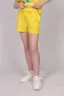 Шорты для девочки прямого силуэта из кулирки. Пояс отрезной в цвет изделия, выполнен из кашкорсе. По поясу шорт вставлен плоский утягивающий шнурок в цвет шорт, низ шнурка подвернут и застрочен. Вдоль пояса шнурок закреплен отстрочкой. В боковых швах выполнены карманы с листочкой. Низ изделия обработан швом в подгибку. На правой передней половинке шорт принт шелкография. Надпись переводится как "Милая ромашка".