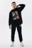 Костюм свободного кроя выполнен из футера 2-х нитки. Состоит из толстовки и брюк. Толстовка с манжетами и поясом из эластичного трикотажа. Рукав втачной со спущенной линией плеча. На полочке принт. Брюки свободной посадки с карманами и манжетами из эластичного трикотажа.