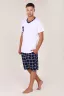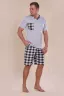 Этот мужской костюм представляет собой комплект для повседневного или домашнего использования, состоящий из белой футболки свободного кроя и темно-синих шорт в клетку.