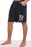 Мужские шорты из футера с лайкрой. Принт в виде надписи, пояс на резинке со шнурком, длина чуть выше коленей. Края изделия не обработаны.