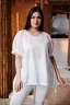 Туника женская, свободная, расклешенная к низу, в стиле "бохо". Рукав реглан с тремя складками, на манжете, короткий. Горловина округлая. На полочке два накладных кармана с обтачкой , вверху на кармане встречная складка, внизу сборка. Низ туники фиксируется завязками.