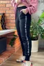 Брюки женские полуприлегающие на манжете. На передней части брюк внутренние карманы. По боковому шву принт в виде лампаса из букв.