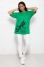 Модель свободного силуэта с принтом шелкография. Горловина круглая обработана обтачкой. Рукав спущенный, выше локтя.