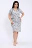 Этот халат представлен в длине миди с короткими рукавами и округлым вырезом горловины. Халат выполнен из ткани с принтом в виде крупных цветов на полосатом фоне. Центральная часть халата украшена вертикальной молнией, которая идет от горловины до нижнего края, позволяя удобно надевать и снимать изделие. Модель также имеет небольшие разрезы внизу для свободы движения. На передней части расположены удобные накладные карманы, выполненные из той же ткани, что и сам халат. Цветовая гамма сочетает оттенки серого и белого, что делает халат стильным и практичным для повседневного ношения.