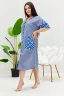 Халат женский прямого силуэта, расширение к низу за счет складки на спинке. Рукав короткий цельнокроенныйсо швом. На полочке и спинке кокетки и накладные карманы. Борт изделия, низ рукавов и вход в карман окантованы широкой бейкой из отделочной ткани. Сочетание отделки из гороха и основной ткани из полоски придают изделию особую актуальность.