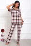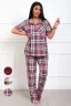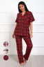 Костюм женский из трикотажа. Состоит из рубашки и брюк. Рубашка прямого кроя, линия плеч на естественном месте, рукав короткий с манжетой. Застежка на пуговицах. Воротник отложной английского типа. На полочках накладные карманы. Низ прямой. Брюки прямые, с цельнокроеным поясом на широкой резинке. На передних половинках располагаются карманы.