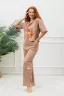 Костюм состоит из укороченной футболки "оверсайз" и брюк. Футболка с округлой горловиной. Рукав короткий, с манжетом. Горловина обработана бейкой из основного полотна. Брюки прямые, на поясе, с боковыми карманами, с накладными карманами по боковым швам.