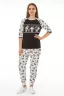 Домашний костюм с брюками и свитшотом с рукавом 3/4 выполнен их мягкого трикотажа на основе 100% хлопка. Материал не теряет форму после стирки и долго сохраняет яркость рисунка. Футболка с рукавом 3/4, брюки прямого кроя на манжетах.