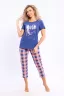 Костюм трикотажный футболка с капри. Футболка темно-синяя с романтическим принтом, короткие рукава. Капри удлиненные, в клеточку со звездами, имеются боковые карманы.