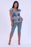 Домашний женский костюм изготовлен из кулирки - 100% хлопка. Женский костюм состоит из майки и брюк. Майка полуприлегающего силуэта с округлой горловиной. Бриджи прилегающие с карманами, притачным поясом, низ обработан на плоскошовной машине.