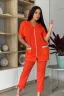 Костюм женский полуприлегающего силуэта - жакет и брюки. Застежка жакета на тесьму-молнию. Капюшон, накладные карманы, боковые части полочки, спинки, лампасы брюк из кашкорсе. Низ брюк с притачными манжетами.