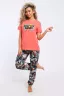 Костюм состоит из футболки и брюк. Футболка свободная с короткими рукавами. Брюки с карманами на резинке внизу.