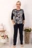 Костюм женский из кулирного полотна состоит из кофты и брюк. Кофта прямой силуэт, горловина круглая, рукав спущенный ¾, на манжете, низ изделия фигурный, перед короче спинки, горловина и низ изделия обработаны окантовкой. Брюки прямые, в боковых швах лампасы из отделочного полотна и внутренние карманы, низ изделия обработан на плоскошовной машине.