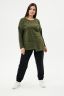 Костюм женский: туника и брюки. Туника прямого силуэта, горловина круглая, рукав длинный, цельнокроеный со швом., состоит из передней и задней частей. Полочка из четырех частей: на правой части внутренний горизонтальный карман в шве, на левой горизонтальный шов с открытыми срезами, аналогичный шов на спинке и на передней части брюк. В боковых швах разрезы. Брюки свободные по бедрам, зауженные к низу, на передней части брюк внутренние карманы. Пояс выполнен на многоигольной машине.