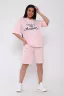 Костюм с шортами из кулирки с лайкрой. Кофта свободная с капюшоном с люверсами и шнурком. По переду принт ,рукав короткий на манжете, длинна до бедра .Шорты свободного покроя с карманами, длина до колена. На модели размер 48-50.Шнурки от партии могут отличаться. Размеры сдвоены.