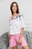Костюм состоит из укороченной футболки "оверсайз" и шорт. Футболка с округлой горловиной. Рукав короткий. Горловина обработана бейкой из основного полотна. Шорты на поясе, с боковыми карманами и лампасами. В верхней части передних половинок по шву притачивания пояса расположены складки. В нижней части боковых швов обработаны разрезы.