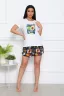 Костюм женский, выполнен из трикотажного полотна кулирка. Костюм состоит из футболки и шорт. Футболка свободного силуэта, горловина окантована, на полочке выполнена печать.