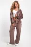 Костюм женский велюровый состоит из толстовки на молнии и брюк. Толстовка с глубоким капюшоном, по низу утягивающий шнур с фиксаторами, рукав спущенный с манжетом, брюки прямые с карманами. Костюм мягкий, удобный, отлично подойдет для дома, прогулок и отдыха.