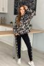 Костюм состоит из толстовки и брюк. Брюки на поясе, с боковыми карманами, с лампасами из отделочного полотна по боковым швам, на резинке по низу. Толстовка прямая, свободная, с капюшоном, с длинным рукавом на манжете. Низ спинки фигурный. В нижней части боковых швов обработаны разрезы.