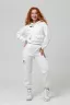 Женский костюм двойка из интерлока. Состоит из укороченной толстовки и брюк. Толстовка с капюшоном, два фальш кармана на полочке и нашивка. Имеется карман с клапаном на рукаве. На брюках две пары карманов, нашивка, верх и низ брюк выполнен резинкой. Модель 42 размера, костюм на ней так же 42 размера.
