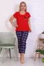 Женская пижама с укороченными брюками в клеточку. Футболка красного цвета с коротким рукавом, на полочке оригинальная печать в виде буквы с короной.