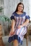 Платье женское полуприлегающего силуэта из ткани в полоску. Рукав короткий цельнокроенный с воланом. На полочке накладные карманы. Кокетка полочки и спинки, воланы рукавов, рюша низа изделия из отделочной ткани. На кокетке полочки и карманах декоративная отделка в виде переплетающейся бейки. На модели 52 размер
