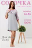 Сорочка женская, состав 100% хлопок. Силуэт сорочки прямой, слегка расширен книзу, горловина и низ рукавов обработаны окантовкой, рукав реглан, низ сорочки обработан на плоскошовной машине, на полочке принт. Идеальный вариант для дома. Изделие легкое в уходе.