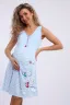 Сорочка женская без рукавов. Данная модель выполнена из трикотажного полотна кулирки (хлопок 100%). Широкие лямки, узор в мелкую крапинку, принт в виде аистов, несущих детей. На груди небольшой бантик, кнопки. Две расцветки — голубая и персик. Размеры от 42 до 54. Горловина и пройма обработана окантовкой из основной ткани и отделочной строчкой Крошетка.