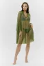 Туника женская пляжная, свободного силуэта с капюшоном и длинным рукавом. Декорирована хольнитенами.
