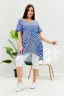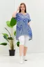 Туника женская, к низу расширенная. Рукав короткий цельнокроенный с манжетой. Горловина Y-образная. Полочка состоит из четырех асимметричных частей, две части по диагонали из ткани в горошек, две другие - из мелкой полоски. Низ фигурный, фиксируется утяжками. По боковым швам разрезы. На полочках два накладных кармана, форма карманов квадраты, расположенные по диагонали, верхние уголки карманов зафиксированы декоративными пуговицами "кокос". Также пуговицы пришиты на отогнутых уголках манжет. Сочетание тканей "горошка" и мелкой полосы придают изделию своеобразную особенность.